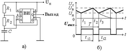 Рисунок 16 – Схема мультивибратора на базе таймера КР602ВИ1 (а) и амплитудно-временные диаграммы работы (б)