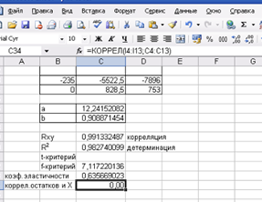 Y = 12,24152 + 0,908871x , коэффициент регрессии составил 0,908871. Экономический смысл параметра регрессии заключается в следующем: с увеличением капиталовложений на 1 единицу выпуск продукции увеличивается на 0,908871 единиц.
