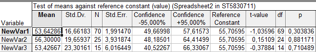 В таблице 2.1 «NewVar1» обозначает выборку размером 70 единиц, «NewVar2» – 25 единиц, «NewVar3» – 15 единиц. В графе «Mean» указаны значения средних по каждой выборке, «Std. Dv.» – стандартное отклонение, «N» – объём выборки, «Std. Err.» – средняя ошибка выборки, «Confidence -95,000%» и «Confidence +95,000%» – соответственно нижняя и верхняя границы доверительного интервала при вероятности 95%, «Reference» – гипотетическое значение генеральной средней величины (известно из первой лабораторной работы), «t-value» – расчетное значение t‑критерия для проверки гипотезы о значении генеральной средней, «df» – число степеней свободы, «p» – расчетный уровень значимости t‑критерия.