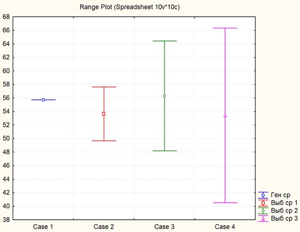 Диаграмма наглядно демонстрирует возможный результат выборочного зондирования исследуемой генеральной совокупности и убедительно иллюстрирует объективную неоднозначность выводов, формулируемых на основе выборочных данных.