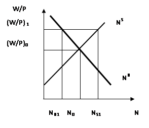 Реальная равновесная заработная плата (W/P)0 устанавливается путем равенства спроса и предложения труда. Любые иные уровни реальной заработной платы показывают избыточное предложение или спрос на труд. При реальной заработной плате (W/P)1 появится ситуация, при которой предложение труда NS1 превысит спрос на труд ND1, т. е. возникнет безработица. Таким образом, в классической канцепции уровень цен и заработной платы является гибким как при повышении, так и при понижении. То есть избыточно высокий уровень реальной заработной платы увеличит издержки призводства благ, что вызовет рост цен и падение реальной заработной платы до равновесного уровня.(7, с.59)