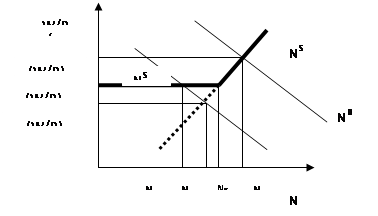 Законодательные решения препятствуют снижению реальной заработной платы ниже определенного минимума. В таком случае предложение труда графически имеет вид «ломаной» линии – NSNS . Если бы мы рассматривали модель в условиях совершенной конкуренции, то линия предложния была бы NS NS’. Пока линия спроса пересекает кривую NSNS’ выше уровня (W/P)m, равновесная заработная плата ((W/P)1 ) и равновесный уровень занятости N1 устанавливаются как и на совершенно конкурентном рынке.