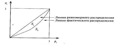По кривой Лоренца (Рисунок 1) можно рассчитать коэффициент Джинни как отношение площади между линиями равномерного и фактического распределения к сумме площадей S1, и S2, которая равна 1/2: