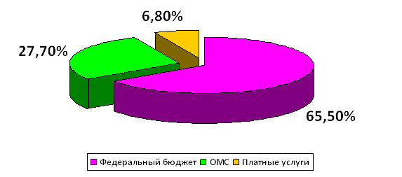 Финансирование Управления происходит за счет трёх основных источников: ОМС, федеральный бюджет и доходы от платных услуг. Как видно из диаграммы, представленной ниже, федеральный бюджет является основным источником финансирования и составляет 65,5 %, далее ОМС – 27,7% и платные услуги – 6,8%.