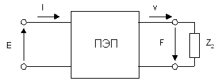 Для анализа переходных процессов в ПЭП применяют различные методы : метод дифференциальных уравнений, четырехполюсника , электрических моделей. Эти методы достаточно подробно изложены в (1) и (2). В методе четырехполюсника связывают входное воздействие и выходную реакцию ПЭП. Ими могут быть различные физические величины. Например, в режиме излучателя входными величинами будут напряжение Е и ток I, а выходными – сила F и колебательная скорость v ( рис.2).