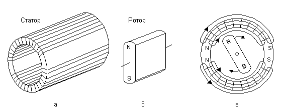 Основными частями электродвигателя являются статор и ротор (рис. 5, а, б) Статор собирается из тонких пермаллоевых колец. Обмотка статора состоит из двух секций, которые включаются встречно. Ротор представляет собой постоянный магнит из феррита. При пропускании тока через обмотки статора они создают в сердечнике магнитные потоки, направленные в разные стороны, поэтому основной поток в сердечнике равен нулю. Но ввиду того, что ширина колец мала по сравнению с их диаметром, образуются потоки рассеяния, сцепленные с обмотками. Получаются как бы два магнита с одинаково расположенными одноименными полюсами. Взаимодействуя с полями этих магнитов, ротор поворачивается, стремясь занять положение, параллельное обмоткам. Динамические характеристики механической системы и параметры тока возбуждения (величина, форма, период) согласованы так, что когда ротор повернется на угол 90 – 100о от исходного крайнего положения, происходит коммутация тока в обмотках и начинается его движение в обратную сторону.