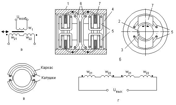 На рис 7, б изображена упрощенная конструкция ДУП. Его основными частями являются статор 1 из мягкой стали, ротор 2 из немагнитной стали (например, 36НХТЮ) с помещенной на нем пластинкой 3 из ферромагнетика, каркас 4 с размещенными на нем парами сигнальных катушек 5 и катушкой возбуждения 6. Сигнальные катушки расположены парами симметрично относительно центра и имеют сложную форму. Для лучшего представления о ней на рис 14, в показан фрагмент каркаса и одна пара катушек. Пары соединяются последовательно, так, чтобы одноименные катушки были включены согласно (рис.7, г). Катушка возбуждения находится между парами сигнальных катушек. При монтаже края ее витков разводят («распушают»). Внутри сигнальных катушек закрепляют ферритовые сердечники 7.