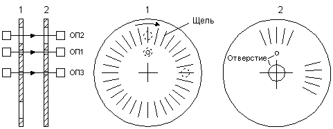 Более подробно устройство оптоэлектронного ДУП поясняет рис.10. Измерение углов производится с помощью ИК оптотоэлектронных пар ОП1, ОП2 и ОП3. Излучение источников проходит через щели и отверстия, расположенные на дисках. На диске 1 по периметру размещены щели (их может быть 128 – 256) и имеется одно отверстие. На диске 2 имеется две группы щелей по 8 –12 в каждой, разнесенные на угол около 90о. Для ИК излучения отверстие и щели диска 2 играют роль коллиматоров. Шаг щелей одной группы такой же, как и на диске 1, а шаг другой группы несколько иной. Одна из групп щелей (с меньшим шагом) выполняет роль нониуса и служит для более точного измерения углов. Метод нониуса широко используется в