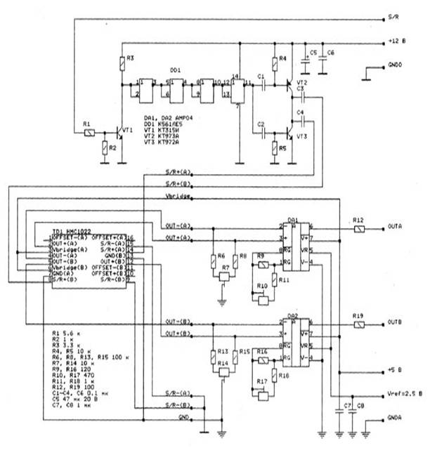 Для усиления выходного сигнала с датчиков производителем рекомендовано использовать аналоговые усилители на микросхемах AMP04 (DA1-DA4).