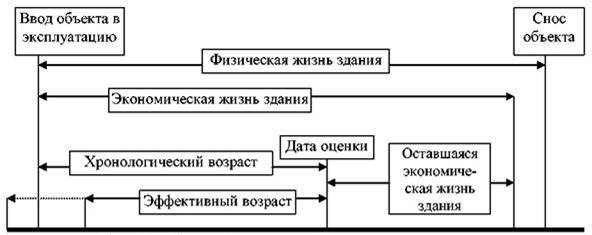 Исходя из сути ранее рассмотренных основных оценочных понятий, характеризующих общий накопленный износ здания с точки зрения времени его эксплуатации, можно утверждать, что физический износ, эффективный возраст и срок экономической жизни находятся в определенном соотношении.