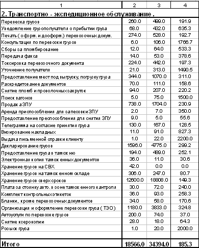 2. Транспортно-экспедиционное обслуживание –перевеска грузов, уведомление получателя о прибытии груза, перевозочных документов, консультации по перевозке грузов, сборы за пломбирование, передача факса, токсировка перевозочного документа, уточнение получателя, предоставления места под погрузку/выгрузку, раскредитовывание документов, снятие пломб, поиск вагонов, запорно-пломбировочные устройства, аренда приспособлений для запрессовки ЗПУ, предоставление приспособлений для снятия ЗПУ, телеграмма на согласие принятия груза, визирование накладных, выдача письменной справки клиенту, декларирование грузов, предоставление груза в таможню, электронная копия таможенных документов, хранение грузов на СВХ, хранение грузов на таможенном складе, плата за стоянку авто. в зоне таможенного контроля, хранение грузов сверх срока, комплект контрольных этикеток, бланки, кроме перевозочных документов, организация и оформление перевозки грузов, автоуслуги по перевозке грузов, снятие ксерокопий, розыск груза.