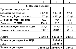 Производство услуг по разовым договорам, оборудование теплушек, подача и уборка вагонов, подача сжатого воздуха, доходы от производства ТНП, стоянка автотракторной техники.
