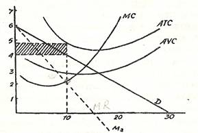 На кривой спроса (D) этот уровень соответствует цене 4 грн. за единицу. Но удельные общие затраты десяти единиц продукции равны 4,60 грн. Значит, при цене в 4 доллара монополист теряет 60 коп. на каждой проданной единице. Общие потери показаны заштрихованным прямоугольником.