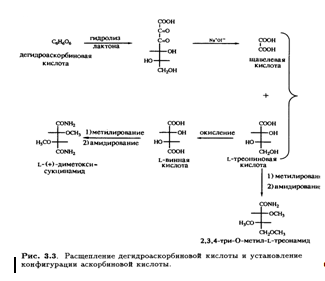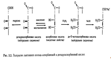 последняя также является лактоном. Эта точка зрения подкреплялась и тем фактом, что диметиласкорбиновая кислота, будучи нейтральным соединением, при обработке гидроксидом натрия дает натриевую соль без отщепления метильной группы, т. е. происходит раскрытие лактонного кольца (рис. 3.2).