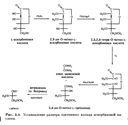 Кроме того, было известно, что в молекуле присутствуют еще две спиртовые ОН-группы, которые при обработке ацетоном образуют производное изопропилидена, также содержащее два енольных гидроксила. Дальнейшее окисление дегидроаскорбиновой кислоты гипоиодитом натрия в щелочной среде приводит к образованию щавелевой и L-треониновой кислот, причем последняя была идентифицирована по ее последовательным превращениям в известные со соединения — L-диметоксисукцинамид и три-О-метил-ь-треонамид. Описанные превращения помогли установить стереохимическое родство природной L-аскорбиновой кислоты и углеводов L-ряда, а также выяснить, что карбонильная группа лактона соседствует непосредственно с ендиольной группировкой (рис. 3.3). Теперь необходимо было выяснить размер лактонного кольца, и это удалось сделать в результате еще одного простого эксперимента. Было известно, что при обработке диазометаном L-аскорбиновая кислота превращается в ди-О-метильное производное. Дальнейшее метилирование иодметаном в присутствии оксида серебра приводит к образованию тетра-О-метилированного соединения, озонолиз которого дает единственный продукт — нейтральный эфир. Под действием аммиака в метаноле эфир деградирует с образованием амида щавелевой кислоты и 3,4-ди-О-метил-Ь-треонамида; последний был идентифицирован по характерной для 2-гидроксиамидов реакции Веермана. Так было показано, что лактонное кольцо замыкается по положению С-2 треонамида, эквиэквивалентного положению С-4 тетра-О-метиласкорбиновой кислоты (рис. 3.4). Таким образом было установлено, что аскорбиновая кислота является 7-лактоном, который изображен на рис. 3.5.