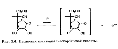 Надо отметить, что в растворе в небольших количествах могут присутствовать и другие таутомерные формы. Асимметрический центр при С-5 имеет L- конфигурацию (или S-конфигурацию согласно системе Кана — Ингольда — Прелога). Кислотные свойства раствора аскорбиновой кислоты обусловлены ионизацией ендиольного гидроксила при С-3 (рКа 4,25), что приводит к делокализации отрицательного заряда в образующемся анионе.