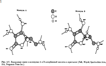 Впервые рентгеноструктурный анализ L-аскорбиновой кислоты был выполнен еще в начале 30-х гг. с целью помочь структурным исследованиям, проводимым в Бирмингеме, и фактически подтвердил выводы бирмингемской группы. В 60-е гг. в работе Хвослефа из Осло, выполненной с помощью методов рентгеновской и нейтронной дифракции, было обнаружено, что кристаллы аскорбиновой кислоты относятся к моноклинной пространственной группе с четырьмя молекулами в элементарной ячейке. В кристалле существует два типа молекул (А и В) с восемью межмолекулярными водородными связями (рис. 3.7).