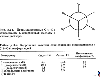 Значения констант спин-спинового взаимодействия J, полученные из таких спектров, позволяют определить преимущественную конформацию L-аскорбиновой кислоты в водном растворе. Например, найдено, что Jh4,H5 составляет 1,8 Гц. Это соответствует предсказанному значению для конформации, изображенной на рис. 3.13. Таким образом, преимущественная конформация вокруг связи С-4—С-5 в водном растворе такая же, как и в кристалле (рис. 3.8).
