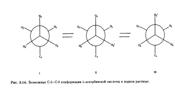Возможные стабильные конформеры представлены на рис. 3.14. Предположив, что наблюдаемые константы спин-спинового взаимодействия являются весовым усреднением теоретических величин для трех конформеров, можно вычислить их населенность (табл. 3.4). И снова предпочтительная конформация вокруг связи С-5—С-6 в растворе идентична обнаруженной в кристалле. Сходство преимущественных конформации боковых цепей в кристаллической решетке и в растворе объясняется, возможно, отсутствием в обоих случаях внутримолекулярных водородных связей. Но, конечно, прочные межмолекулярные водородные связи образуются между соседними молекулами аскорбиновой кислоты в кристалле и с молекулами воды в водном окружении.