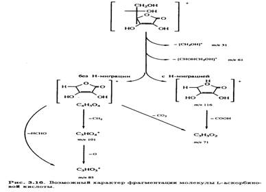 В масс-спектре L-аскорбиновой кислоты, зафиксированном при ионизации молекулы под действием электронного удара, имеется интенсивный пик с m/е 116 наряду с пиком молекулярного иона (m/е 176) (рис. 3.15). Было высказано предположение, что фрагментация происходит за счет отщепления боковой цепи с последующим разрушением кольца, что соответствует наличию наиболее интенсивных сигналов (рис. 3.16).