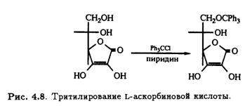 Как и у многих углеводов, первичный гидроксил при С-6 L-аскорбиновой кислоты легко подвергается трифенилметилированию (тритилированию) под действием трифенилхлорметана в пиридине (рис. 4.8).