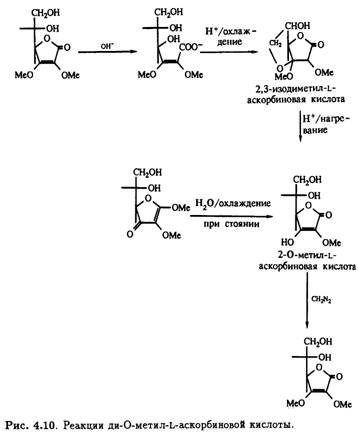 Под действием щелочи с последующим подкислением 2,3-ди-О-метильное производное претерпевает интересную цепь превращений. Образуется не простой моноциклический лактон, а бициклическое производное с единственным свободным гидроксилом — 2,3-изодиметил-L-аскорбиновая кислота. Кислотный гидролиз этого продукта приводит к 3-О-метил-L-аскорбиновой кислоте, которая также получается при стоянии на холоду водного раствора 1,2-ди- O-метил- ψ-L- аскорбиновой кислоты, что сопровождается потерей лабильного метильного остатка при С-1. Как и следовало ожидать, 3-O-метил-L-аскорбиновая кислота легко метилируется под действием диазометана в эфире, образуя 2,3-ди-О-метилированное производное. Описанные превращения суммированы на рис. .10.