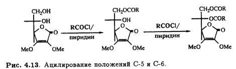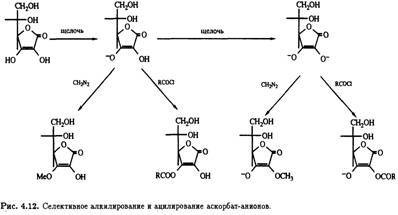 Потеря второго протона гидроксилом при С-2 (рКа = 11,79) приводит к образованию дианиона, который селективно алкилируется и ацилируется по тому положению (рис. 4.12).