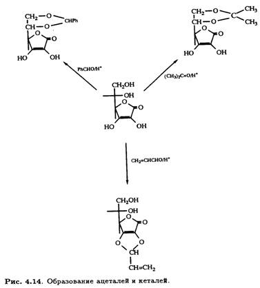 Катализируемое кислотами образование ацеталей и кеталей аскорбиновой кислоты применяется для специфической защиты одновременно двух гидроксильных групп в процессе структурной модификации. Такие 5,6-О-производные, как изопропилиденкеталь и бензилиденацеталь, хорошо известны, а недавно появилась возможность селективно защищать гидроксильные группы при