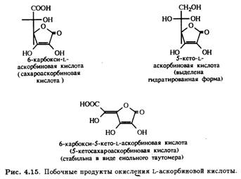 Окисление первичной и вторичной спиртовых групп аскорбиновой кислоты при С-5 и С-6 может теоретически приводить к образованию ряда побочных продуктов. Получение таких производных непосредственно из L-аскорбиновой кислоты требует селективной защиты гидроксилов при С-2 и С-3. На рис. 4.15 приведены примеры соединений такого типа, которые удалось выделить.