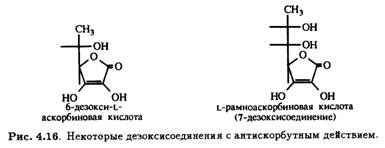 Известно, что 6-дезокси-L-аскорбиновая и L-рамноаскорбиновая кислоты (рис. 4.16) сохраняют соответственно 30 и 20% антискорбутной активности витамина С. В последние годы были синтезированы еще некоторые соединения такого типа (рис. 4.17). Обнадеживает, что 6-хлор-6-дезоксипроизводное обладает повышенной термической стабильностью по сравнению с витамином С и в то же время обладает заметной антицинготной активностью.