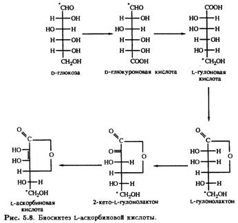 Считается, что все хлорофиллсодержащие растения и прорастающие семена могут синтезировать аскорбиновую кислоту согласно схеме, приведенной на рис. 5.8.