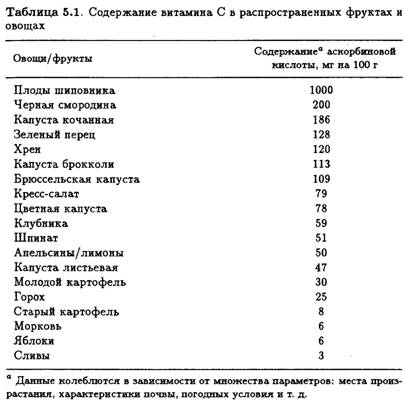 и листовые овощи. Очень богаты витамином С гуава (300 мг/100 г) и черная смородина (200 мг/100 г), но они не слишком распространены в западных странах. В табл. 5.1 приведены исчерпывающие данные о содержании витамина С в наиболее употребляемых овощах и фруктах.