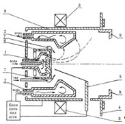 Рисунок 1.1 - Схема плазменного ускорителя "Пуск-КуАИ": 1 - катод; 2 - анод; 3 - соленоид; 4 - фланец крепления генератора к вакуумной камере; 5 -электрод поджига дуги; б - система защиты от сброса дуги на боковую поверхность катода; 7 - канал подачи реакционных газов; 8 - дополнительный анод; 9 - съемный кольцевой экран. Пунктиром проведены силовые линии электрического и магнитного поля