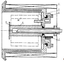 Рисунок 1.2 - Схема магнетронной цилиндрической системы. 1- соленоид, 2 - водоохлаждаемый корпус камеры, 3 — анод, 4 — катод, 5 - защитный экран, б — отражатель электронов разряда, 7 — канал подачи газа