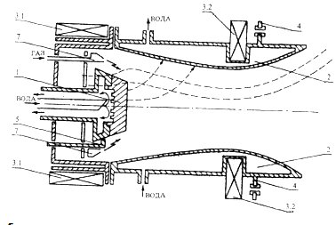Рисунок 1.3 - Схема плазменного генератора с магнитной ловушкой электронов "Пуск-Мэл": 1 - катод; 2 - профилированный анод; 3.1 и 3.2 - соленоиды; 4 - фланец крепления генератора к вакуумной камере; 5 - электрод поджига дуги; 7 - канал подачи реакционных газов. Пунктиром проведены силовые линии электрического и магнитного поля.