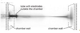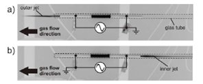 Самый простой вид этого APPJ источника состоит из диэлектрической трубы с двумя трубчатыми металлическими электродами и некоторого благородного газа (He, Ar), протекающего через нее. Для демонстрации того, что реактивный поток является главным образом электрическим явлением, а не единым потоком, он был отснят при помощи обычной цифровой (CCD) камеры со временем задержки в 1 секунду. (Смотрите рисунок 2.1). Для получения лучшего контраста при печати фотографии были конвертированы в черно-белые. В обоих случаях все параметры являлись схожими, кроме подключения электропитания к сети, как показано на рисунках. (Трубка изготовлена из кварцевого стекла с внутренним диаметром 4 мм, окруженная двумя алюминиевыми электродами длиной 5 см. Эти параметры неизменны для всех фотографий, представленных здесь. Используемое напряжение является синусоидальным с максимальным значением 7 кВ при частоте 13 кГц. Реактивный поток потребляет электрическую мощность примерно в 4 Вт.) Если передний электрод активен, а задний заземлен, как показано на рисунке 2.1(а), то труба развивает внешний поток. Однако если источник подключен к питанию наоборот (передний электрод заземлен), то внутренний реактивный поток формируется против газового потока (рисунок 2.1(б)). Это дает яркий признак того, что реактивный поток использует потенциальное различие для окружающей среды.