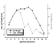 На данной диаграмме обе кривые растянуты. Черная кривая, отмеченная квадратными символами, описывает зависимость газового потока, а серая показывает оптимальное пиковое значение поданного напряжения, где в соответствии с типом потока была соблюдена максимальная длина реактивного потока.