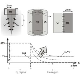Поскольку длина распространения обоих газов (< 1 мкм) является намного меньшей, чем рассмотренный здесь диаметр цилиндра гелия (4 мм), то это позволяет использовать одномерное решение второго закона Фика.