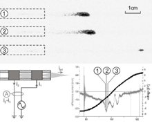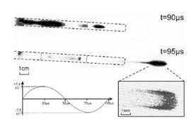 «Пуля» всегда появляется при повышении наклона кривой поданного напряжения. Еще одно важное открытие состоит в том, что полное истечение времени реактивного распространения является почти независимым от частоты и формы кривой поданного напряжения в исследованном диапазоне (1..50 кГц, синусоидальная, прямоугольная и треугольная форма кривой напряжения). «Пуля» вылетает в течении нескольких микросекунд в одной и той же точке на стадии каждого периода.