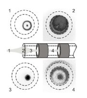 Если «пуля» располагается вне источника (рисунок 2.8(1)), то картина состоит из интенсивного свечения в центре и более слабого, кольцевой формы свечения вокруг него. Если цветные фотографии представляют сторону реактивного потока, то они сделаны при помощи стандартной камеры (с высоким временем задержки) по аналогии с рисунком 2.1 и рисунком 2.4, всегда тонкая красноватая линия в центре blueish (если blue ish – то синий выход) реактивного потока может быть соблюдена. Это кажется синей точкой, наблюдаемой на переднем плане. Это мог быть жар (свет, излучение) гелия, а кольцо вокруг него могло быть жаром (светом) азота. Для подтверждения данного утверждения (тезиса) должно быть проведено дополнительное спектроскопическое исследование.