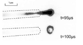 На рисунке черные пунктирные линии отмечают границы источника. Источник прозрачен по всей своей длине. Это возможно, если сделать разрез в параллели электродов к газовому направлению потока. Влияние на внутреннее поддерживаемое распределение незначительно. Может быть замечено, что реактивный поток не постоянен во времени. Фактически, это «плазменная пуля», выстрелянная из трубы со скоростью, которая намного превышает газовую скорость. На рисунке 2.7 «пуля» проходит расстояние в 7,5 см за 5мсек. Это соответствует скорости 15 км/сек. В среднем расчетная газовая скорость составляет 16,5 м/сек. Вот еще один дополнительный аргумент для утверждения, что это не явление потока.