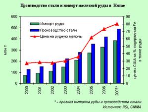 Доминирующее положение на мировом рынке железной руды все более уверенно занимает динамично развивающийся Китай, чему главным образом способствует рост спроса на этот важнейший вид сырья в стране. В 2009 г. в Китае было произведено около 880 млн. тонн сырой железной руды (не подвергнутой обогащению) или в пересчете на железорудный концентрат (64-66% Fe) - примерно 330 млн. тонн железорудного сырья. Производимого в Китае железорудного концентрата совершенно недостаточно для обеспечения потребностей китайских металлургических предприятий, поэтому в 2009 г. импорт железорудного сырья значительно увеличился. Потребление импортного железорудного сырья в Китае в 2009 г. по отношению к общему потреблению этого сырья выросло до 69% по сравнению с 44% в 2008 г.