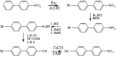 4-нитробифенил получали по описанной в работе (1) методике. 4-Бром-4’-нитробифенил получали нагреванием смеси 4-нитробифенила, ледяной уксусной кислоты и брома, охлаждали и фильтровали осадок 4-бром-4’-нитробифенила, затем, его перекристаллизовывали из ледяной уксусной кислоты. 4-амино-4’-бромбифенил получали восстановлением 4-бром-4’-нитробифенила порошкообразным железом с соляной кислотой в этиловом спирте. Затем полученный амин диазотировали нитритом натрия с соляной кислотой при 00 и получали хлорид диазония, который затем превращали в тетрафторборат. Тетрафторборат 4-бромбифенил-4’-диазония нагревали с трифторуксусной кислотой и получали 4-бром-4’-гидроксибифенил, который кипятили в диметилформамиде с цианидом меди (1).