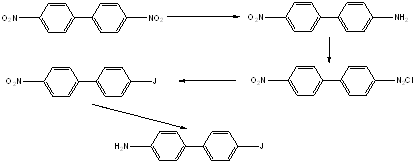 4-амино-4’-нитробифенил получали добавлением гидрата сульфида натрия и серы к кипящему спиртовому раствору 4,4’-динитробифенила. Полученный 4-амино-4’-нитробифенил отделяют, перекристаллизовывают из ацетона, а затем диазотируют в ледяной уксусной кислоте нитритомнатрия при 100. Раствор соли диазония разлагают с йодидом калия при нагревании на водяной бане. Затем полученный 4-йод-4’-нитробифенил восстанавливали при кипячении в растворе этанола с концентрированной соляной кислотой добавлением маленькими порциями порошкообразного цинка. Полученный продукт экстрагировали эфиром, затем перекристаллизовывали петролейным эфиром. Получили 4-амино-4’-йодбифенил т. пл. 1650(6).