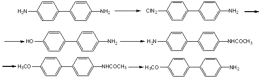 Сначала бензидин растворяют в соляной кислоте, к раствору при охлаждении добавляют нитрит натрия. Соль диазония разлагают интенсивно кипящей водой. Полученный 4-гидрокси-4’-аминобифенил экстрагируют 1%м раствором щелочи(расход щелочи 5-6 литров на 50г бензидина). После очистки получается чистый продукт, т.пл. 272,5-224. 4-гидрокси-4’-ацетиламинобифенил получают ацилированием 4-гидрокси-4’-аминобифенила ледяной уксусной кислотой. Алкилируют путем добавления KOH, а, затем, йодистого метила, с последующим гидролизом смесью уксусной и соляной кислот с водой.