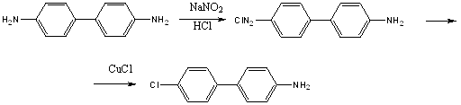 На первой стадии сначала получают раствор бензидина в концентрированной соляной кислоте, который затем охлаждают и диазотируют. Раствор соли диазония по каплям прибавляют к свежеприготовленной однохлористой меди. Продукт экстрагируют соляной кислотой (7-8%) при кипячении. Для выделения из соли свободного 4-амино-4’-хлорбифенила продукт обрабатывают раствором 10%-го аммиака.