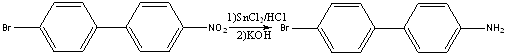 К 15,02г (0,054моль) 4-бром-4’-нитробифенила в 120мл спирта прибавили раствор 54г (0,24моль) дигидрата хлорида олова(II) в 60мл концентрированной соляной кислоты. Смесь нагревали 2ч на кипящей водяной бане при перемешивании. Затем раствор охладили, разбавили трехкратным объемом воды. Образовавшийся осадок соли амина отфильтровали, к нему прибавили раствор 50г KOH в 70мл воды. Смесь перемешивали в течение двух часов, затем добавили 100мл воды и отфильтровали осадок амина. Осадок промыли водой до нейтральной реакции и высушили на воздухе. Масса 4-бром-4’-аминобифенила составила 12,24г (выход 91%), т.пл. – 145-1470. Лит.данные (3): т.пл. 143-145о