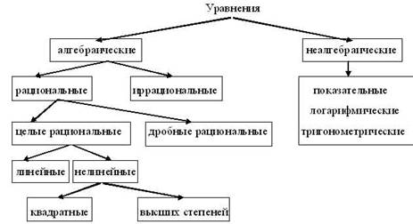 Классификация уравнений тесно связана с конкретными функциями, изучаемыми в школьном курсе математики. В соответствии с этим в школьном курсе алгебры выделяются определенные виды уравнений: