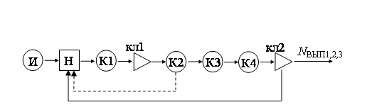 В качестве типовой математической схемы применяется Q-схема, состоящая из одного источника (И), накопителя (Н), четырех каналов (К1, К2, К3, К4), двух клапанов (рис. 2). После генерации заданий в источнике И, следует их запуск при помощи дисплея, канал К1, работая на нем 55±35 сек. После запуска задание поступают в накопитель Н, а затем в клапан 1, который управляется каналом К2. Если в канале К2 выполняется задание с более высоким приоритетом, то задание поступает в накопитель Н. Если канал К2 свободен, или обрабатывается задание с более низким приоритетом, то начинается обработка поступившего задания в течении 130±40 сек. После обработки задание поступает в канал К3, где выводится на печать в течении 35±13 сек. Затем задание поступает в канал К4, где производится анализ задания в течение 65±23 сек. Клапан 2 принимает задания от канала К4, управляется соответствующим каналом, при этом выполнение задания либо заканчивается NВЫП1,2,3, либо отправляется в накопитель Н для повторной обработки.