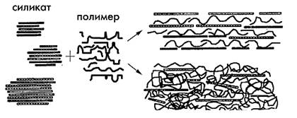 Слоистые нанокомпозиты на основе алюмосиликата и поли мерас низким его содержанием (справа вверху) и высоким.
